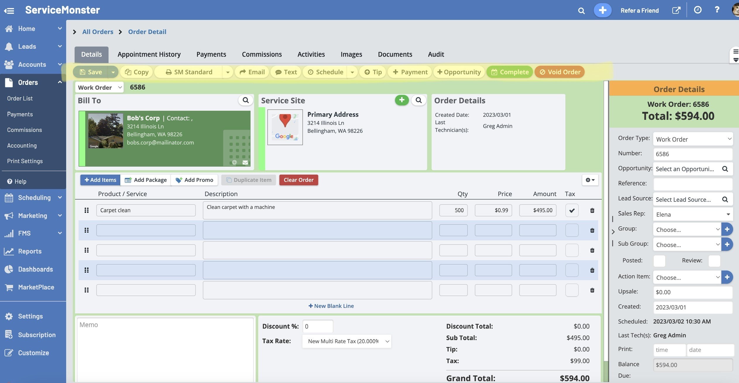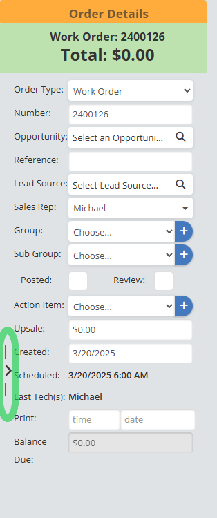 The Order Details Page is where you can create a new Estimate, Work Order, or Invoice. You can view and edit all the saved details for an order, complete, or void.