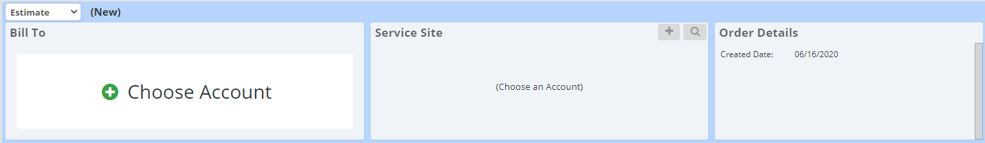Choose Order Type: In the drop-down menu in the top left corner, you can select what type of order you are creating, either an Estimate, Work Order, or Invoice.