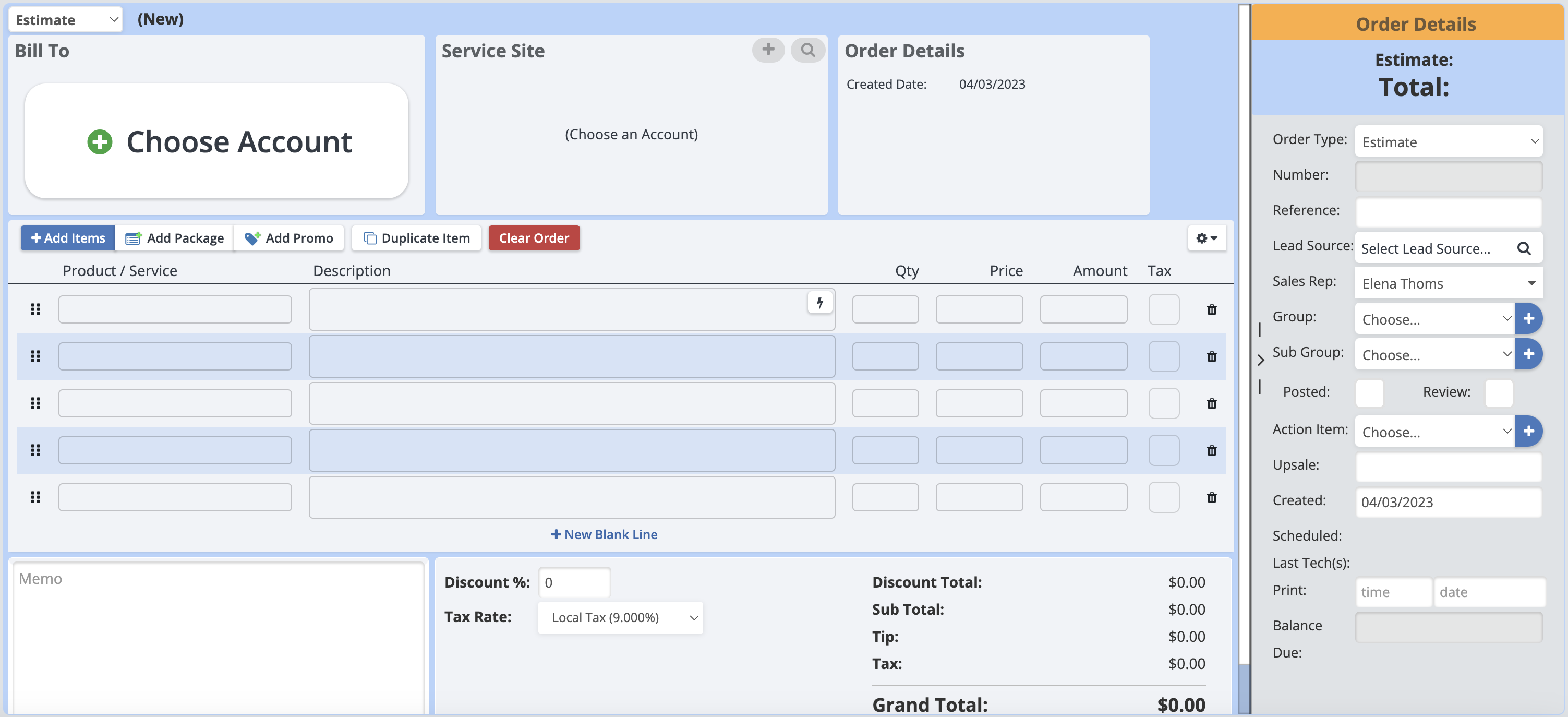 This is the Order Details Page for a blank new order.
