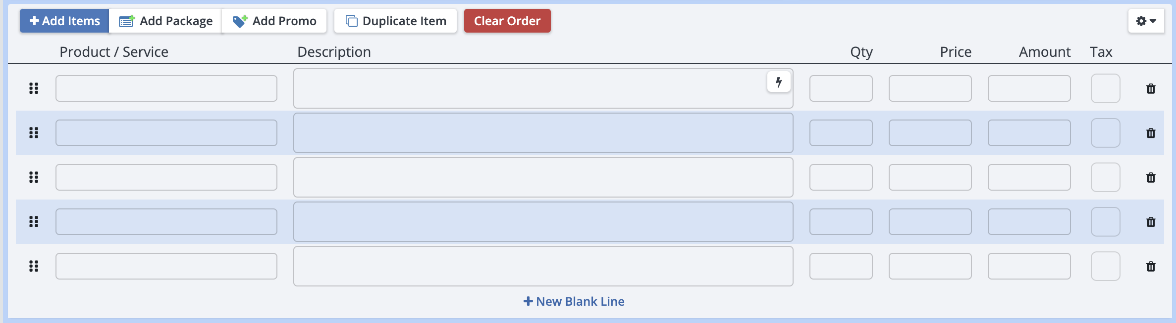 + New Blank Line: This button adds a new blank line item. The Qty or description must be filled in here, you cannot add a fully blank line.