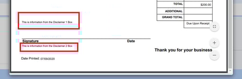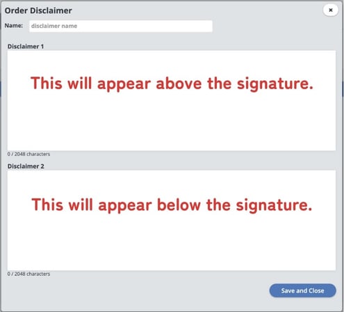 The "Disclaimer 1" box will appear on order forms above the signature, whereas the "Disclaimer 2" box will appear below the signature.