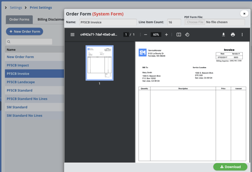 Order Forms: The forms that ServiceMonster creates for you for your Estimates, Work Orders, and Invoices. These forms use information from your company settings, the client’s account, and the order to create easily understood and clear documents you can give to your clients.