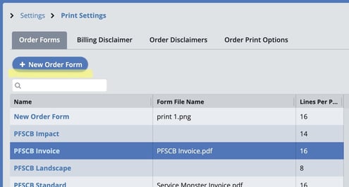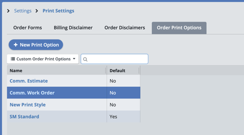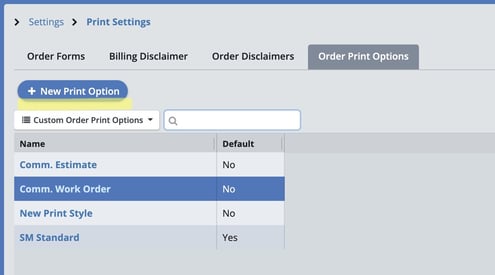 To see or edit your Print Options, go to the “Order Print Options” tab. Your Print Options are what you can choose between when printing or creating your Order Forms.