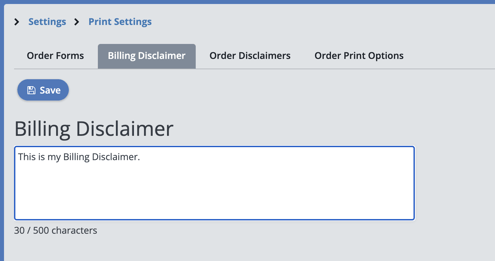 On the Billing Disclaimer page, type your billing disclaimer into the box and click “Save”.