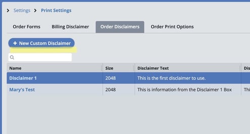 To create a new order disclaimer, click on the “+ New Custom Disclaimer” button.