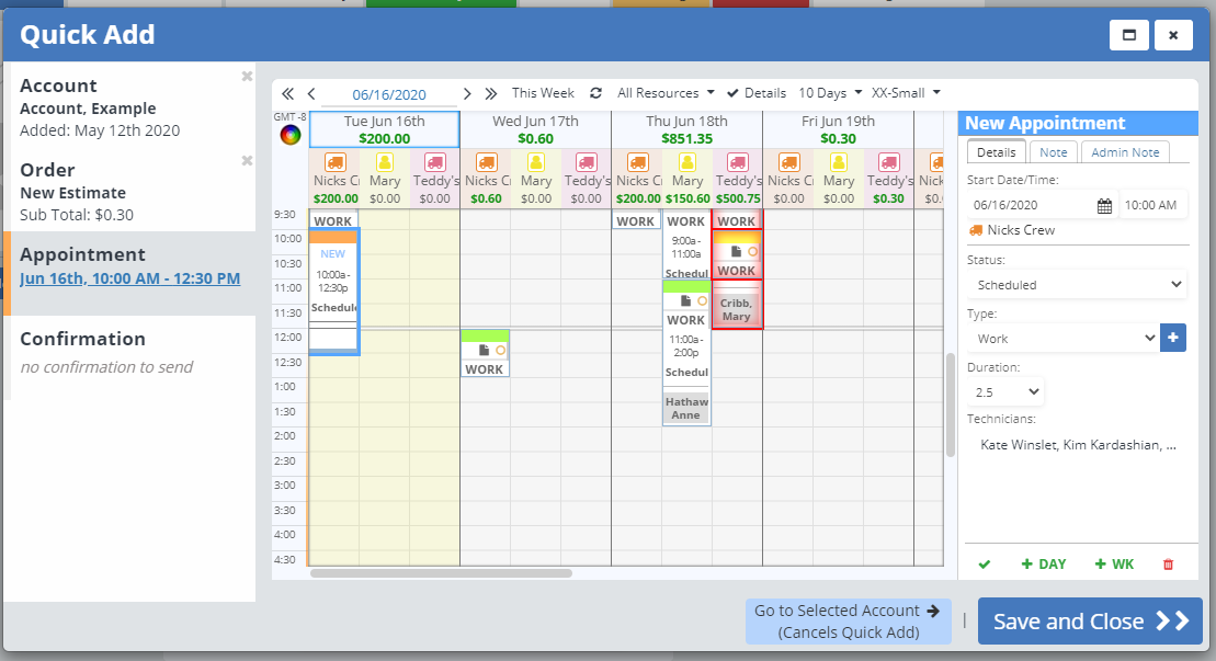 Click "Save and Close" to send out those confirmations, as well as create your Appointment, Order, and Account.
