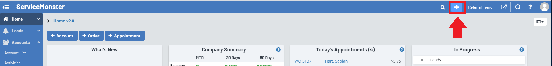 The Quick Add button is available anywhere on ServiceMonster by clicking on the small blue "+" at the top of the screen.