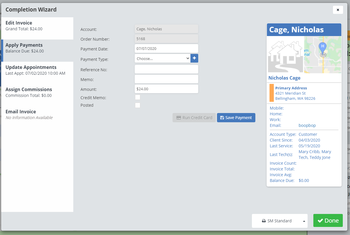 Run Credit Card: If you are connected with Stripe or Authorize.net you can run payments right through the desktop version of ServiceMonster by clicking here.