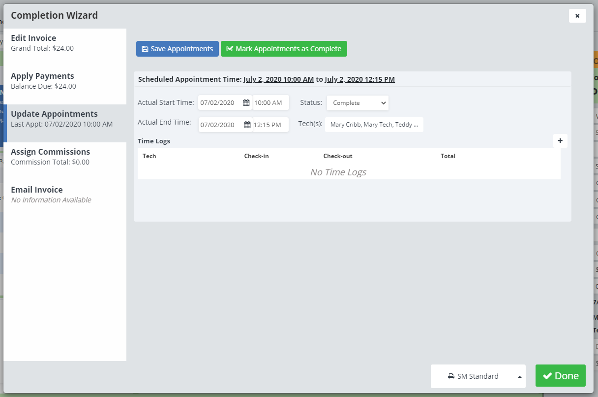 Here you can update the appointment information, adjusting the start and end time, as well as view and edit time logs for employees. If your employees have signed in and out of an appointment using the mobile app then the actual start time and end times for the appointment will automatically change to the earliest time a tech clocked in, and the latest time a tech clocked out.
