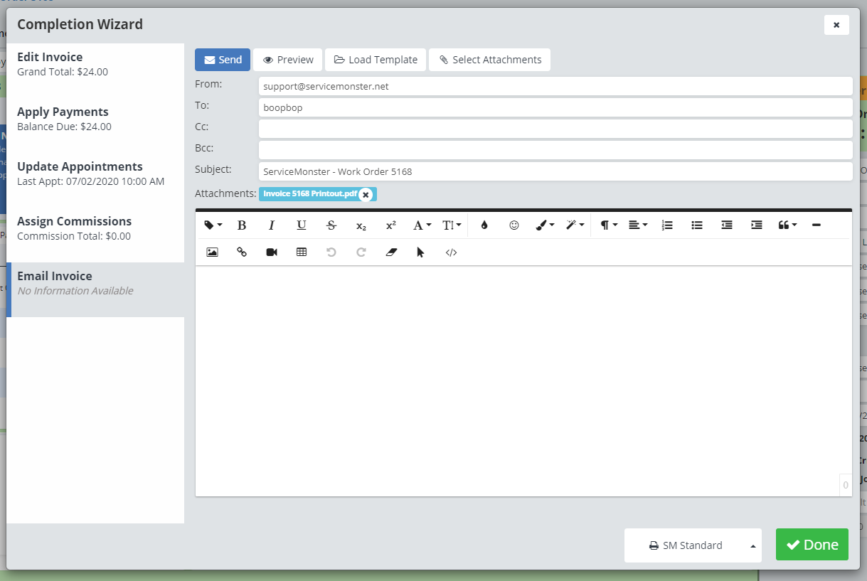 Note: Invoices can not be edited outside of this completion wizard. If you want to make edits to the order, you will need to either return to this completion wizard or turn it back into a work order, make your edits, then turn it back again into an Invoice.