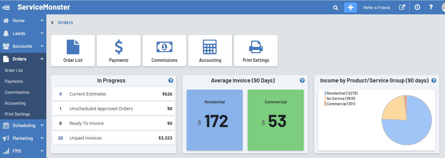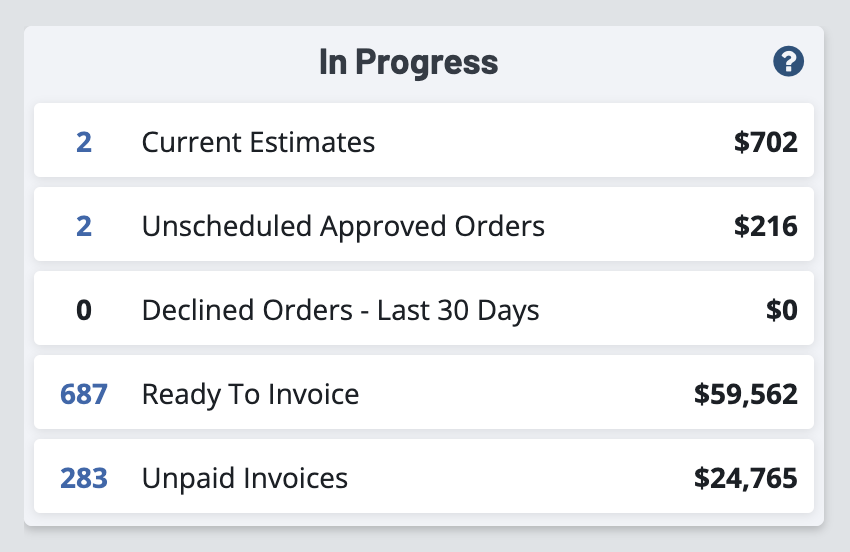 Ready To Invoice: The count of work orders that had a scheduled past appointment (with no further appointments scheduled in the future) and are ready to invoice, and their total potential revenue. This section helps you identify orders that are ready to invoice, or the order was cancelled/postponed and not properly removed from the schedule.