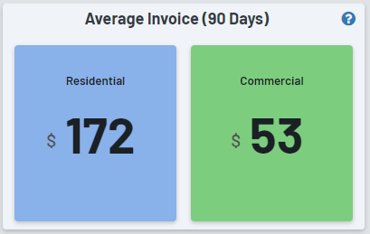 This shows the average invoice total, broken down by residential and commercial customers, over a rolling 90 day period. The large number represents the average $ amount this period, while the smaller number represents a growth (green) or decline (red) in the average invoice amount