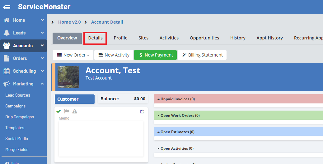 To assign payment terms to an account, open the account and go to the “Details” tab.