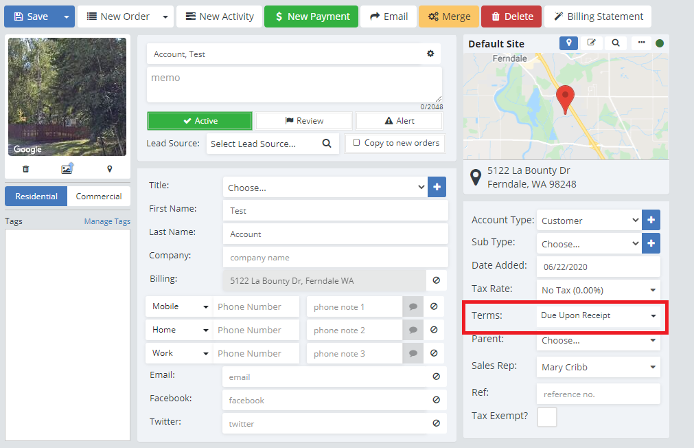 This article is how to set terms for individual accounts. You can set your default terms for Residential & Commercial accounts in Settings -> Company Settings -> Customer Default Settings.