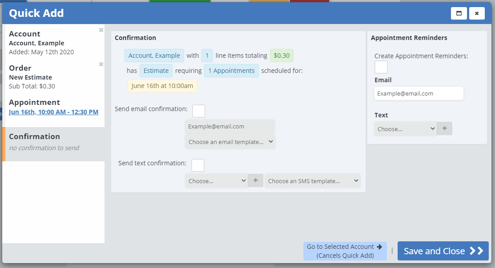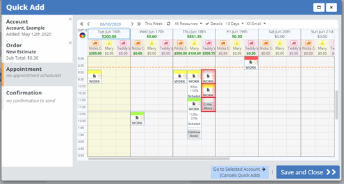 Save and Close: If you have clicked on the schedule to add in an appointment, then if you click on the save and close you will create an appointment on the schedule, as well as a new order or account if you have created those.