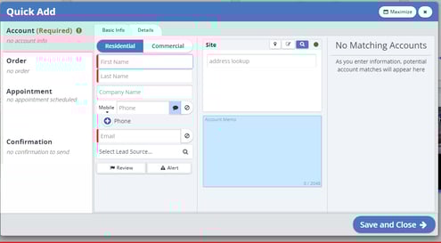 Here you can begin adding in the details of the account. If you are looking for a preexisting account, then all you have to do is start typing in the details for the account and ServiceMonster will list any possible matches in the column on the right-hand side. If it is not a preexisting account, you can simply fill out all the account details.