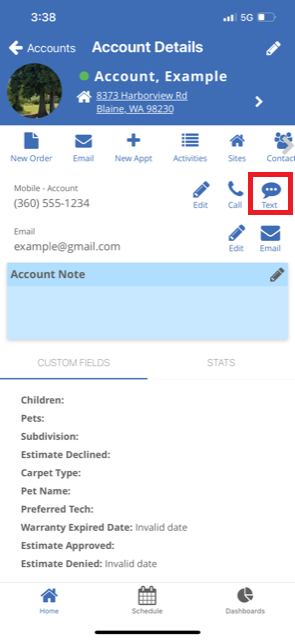 In the mobile app, open an order or account. Next to the client’s contact information, click on the “Text” button.