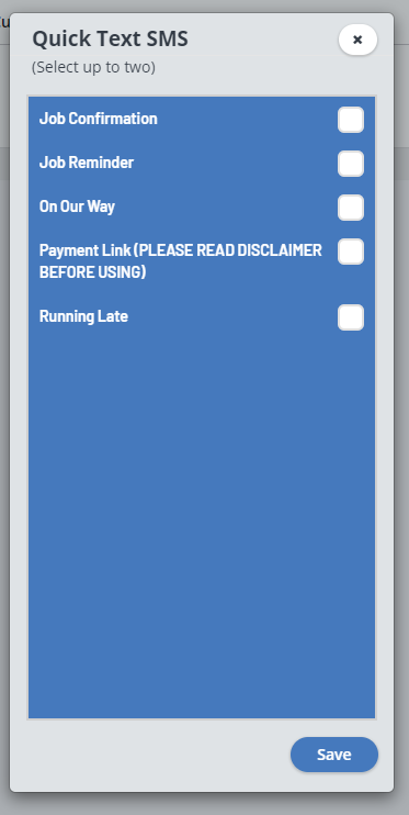 This will open a menu where you can select what templates will be available for quick text from the mobile app. Select your options and click “Save”.