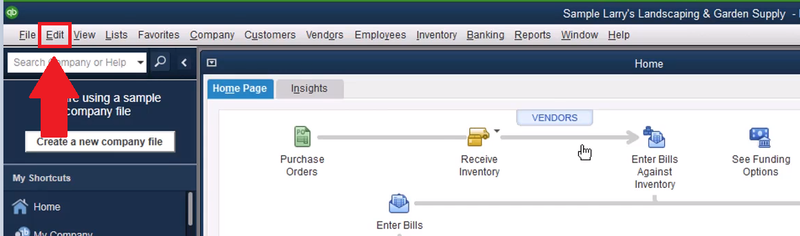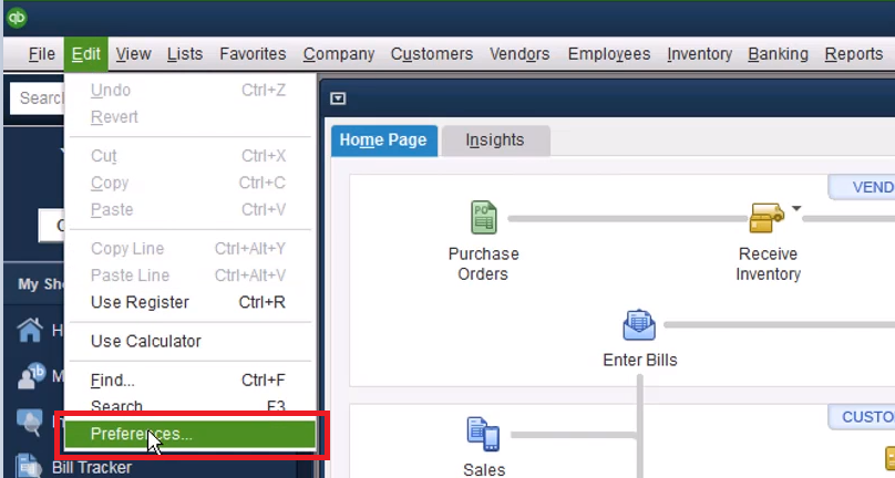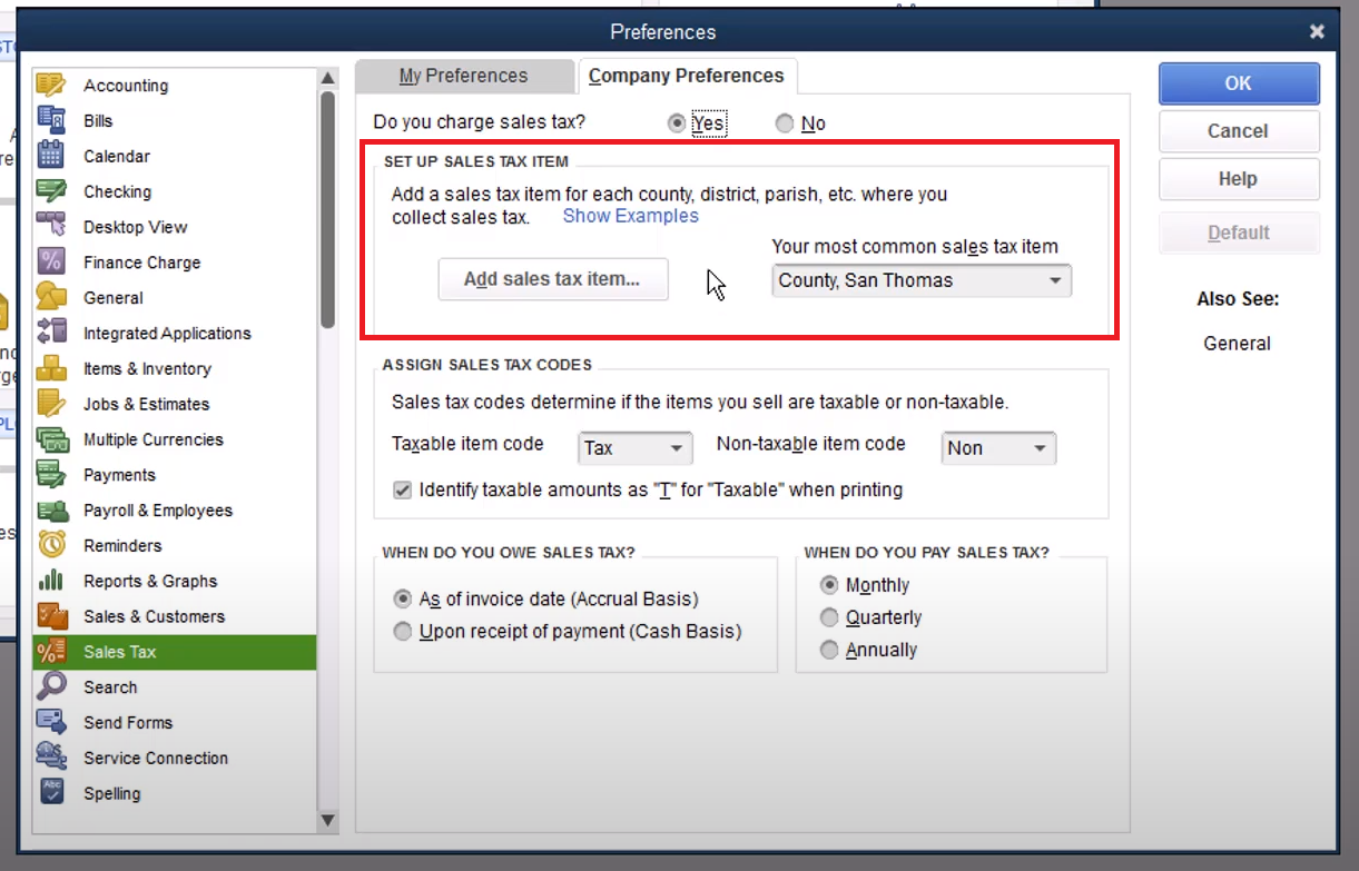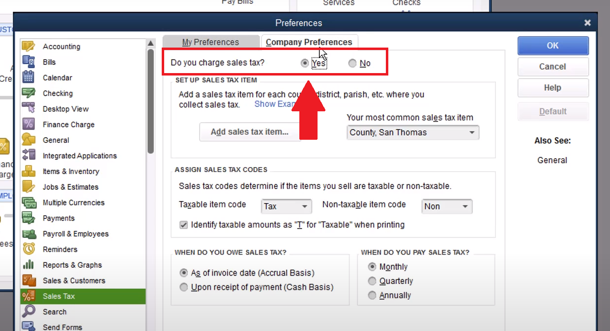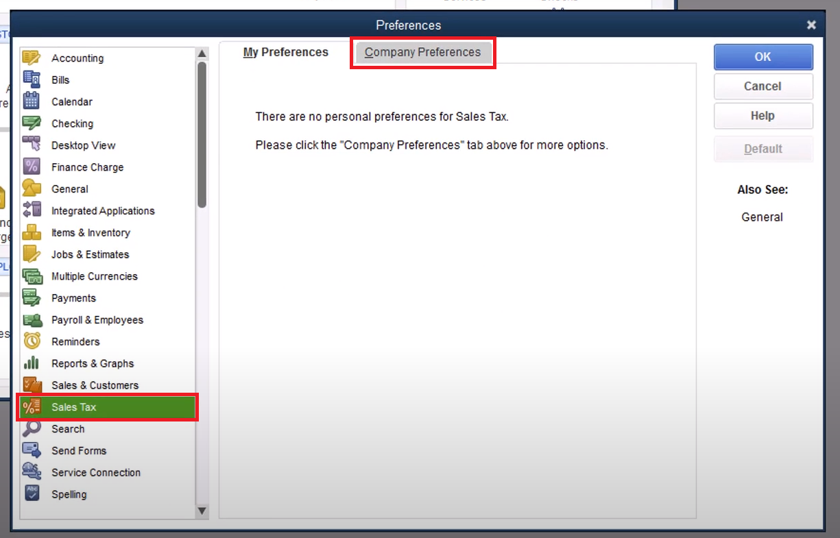 In the preferences pop-up, make sure you are in “Sales Tax” (left-hand side). Select the Company Preferences subtab (top).