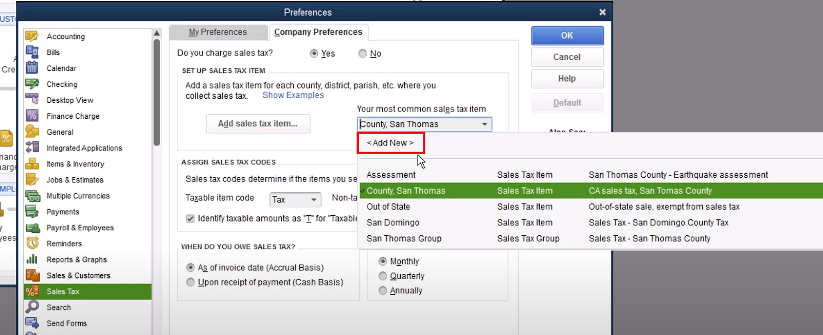 Then, in the drop-down menu for “Your Most common sales tax item” select “< Add New >”