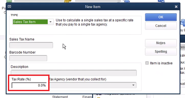 In the “New Item” window that pops up, leave the Tax Rate at 0.0%