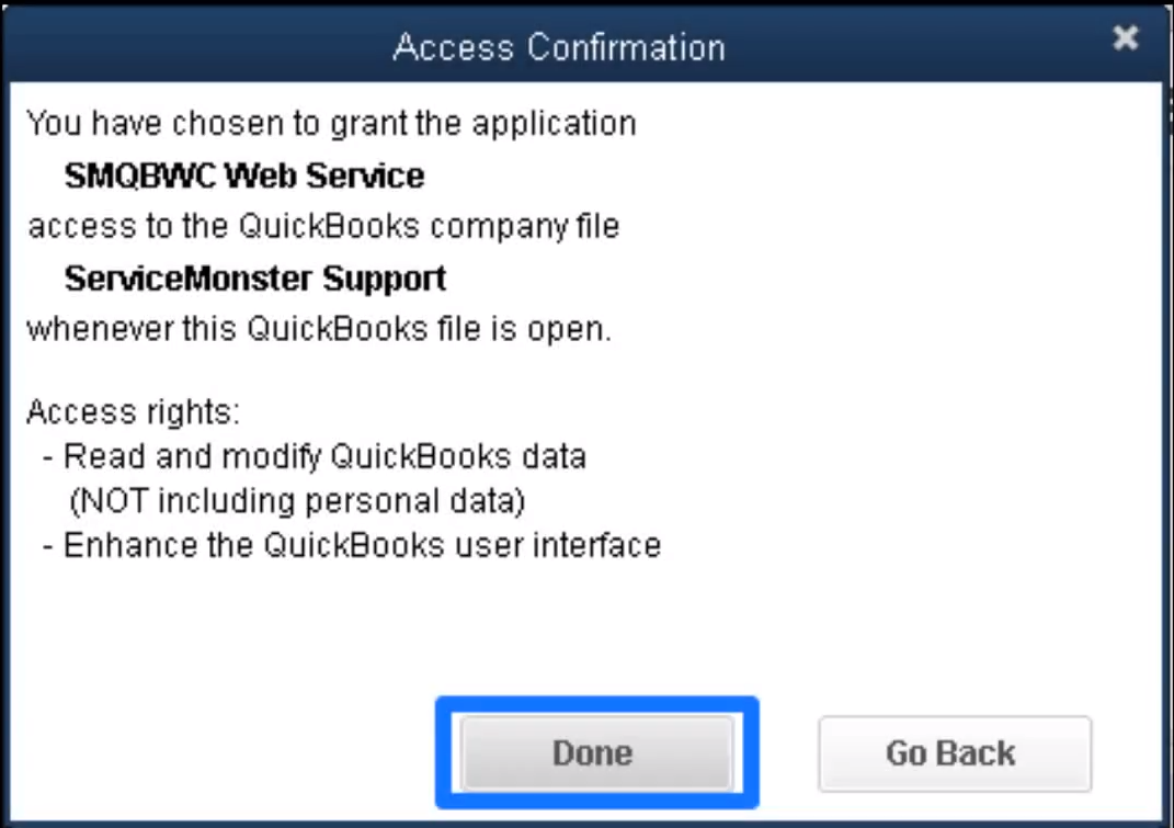 The last message is the Access Confirmation message. This security message is simply confirming web service communication between QuickBooks and ServiceMonster 6. Select “Done”.