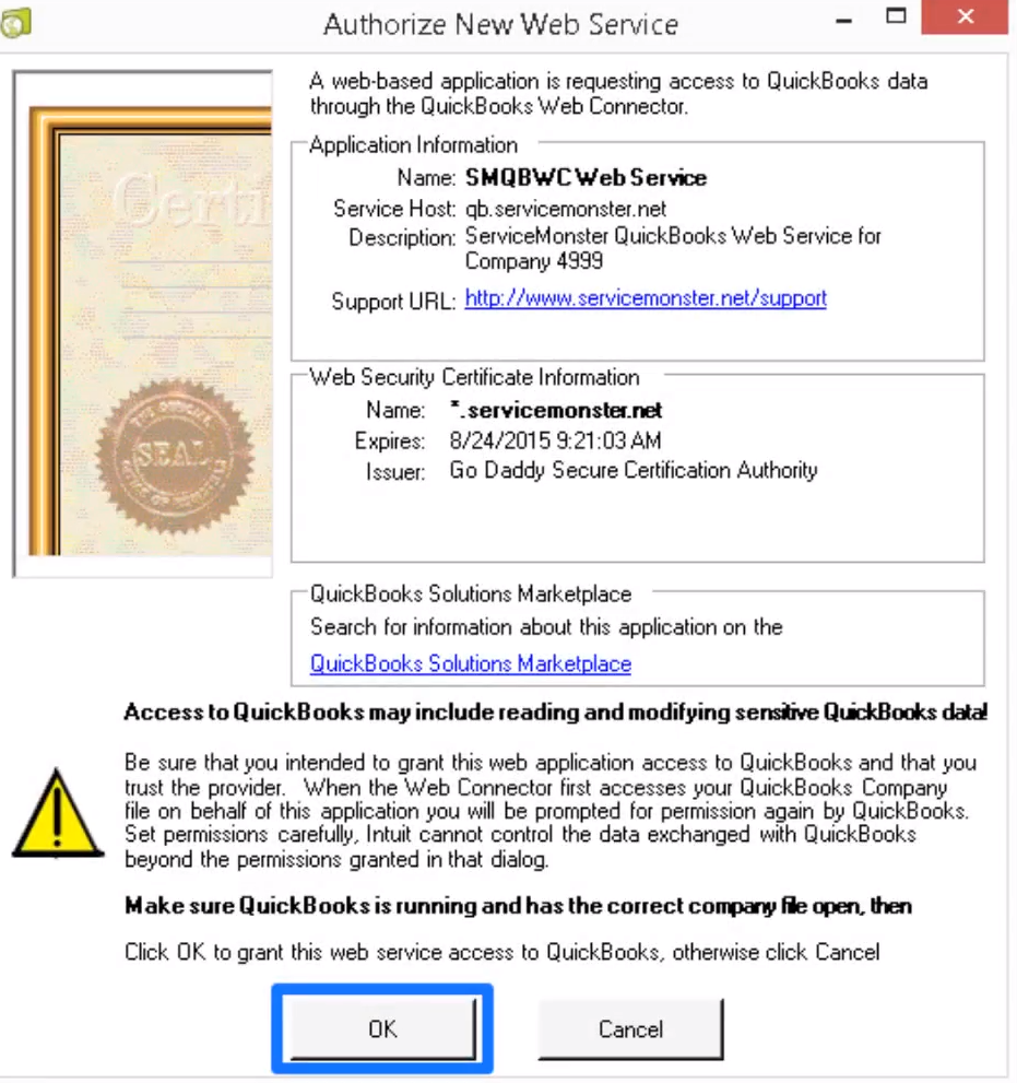 The first one will ask you to Authorize a New Web Service. Its purpose is to give the web connector permission to communicate between QuickBooks and ServiceMonster. Click the OK button.