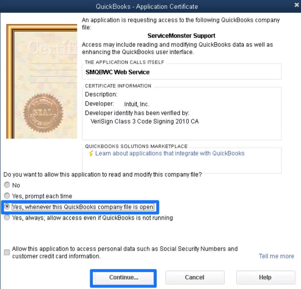 Then, you will see the Application Certificate security message. Select the 3rd option "Yes, whenever this QuickBooks company file is open", then click continue.