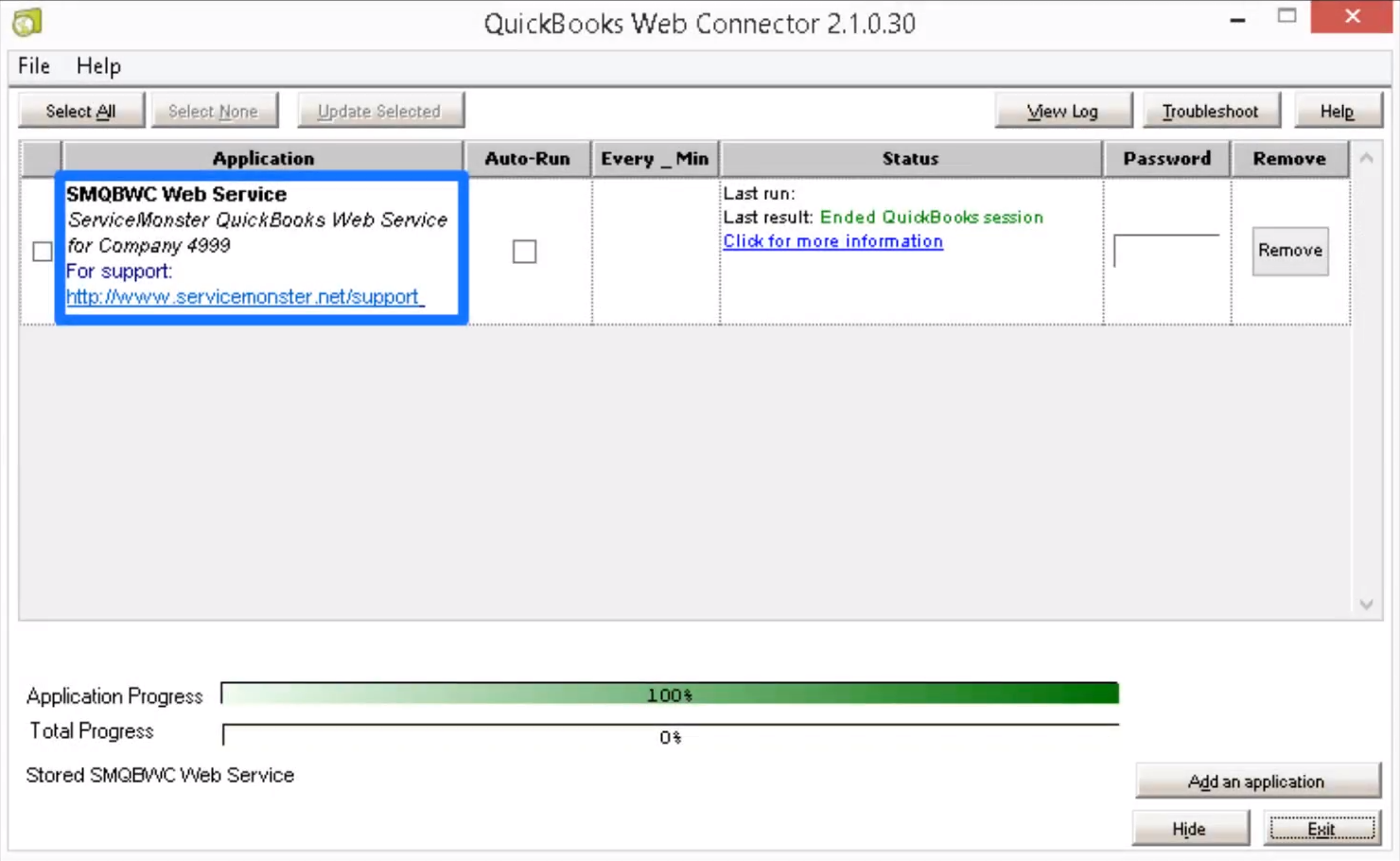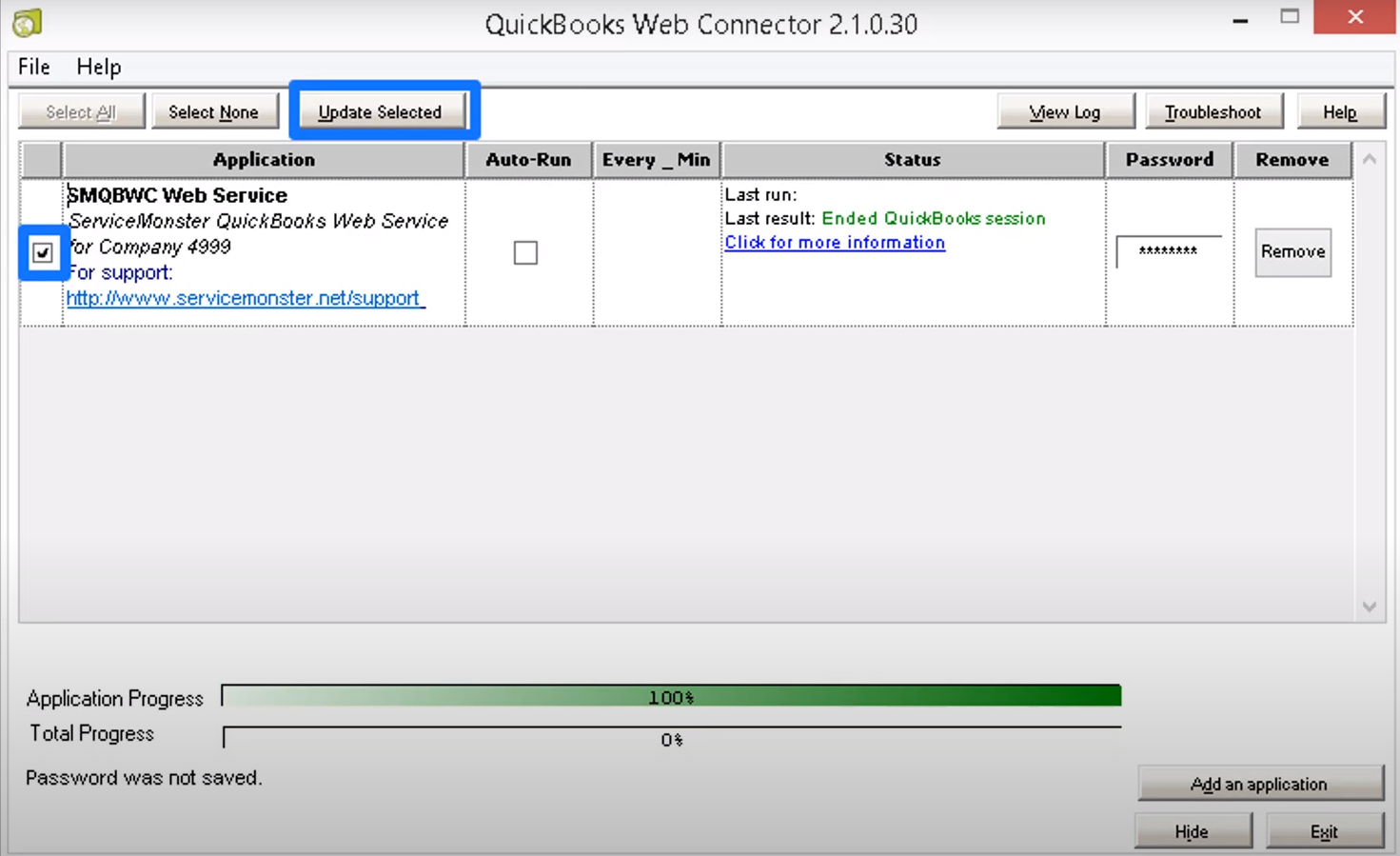 Check the “SMQBWC Web Service” box, In the “Password” box (right-hand side), input your ServiceMonster password, the same password you used to download this file. Then click “Enter” on your keyboard.
