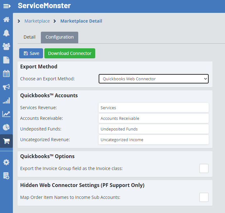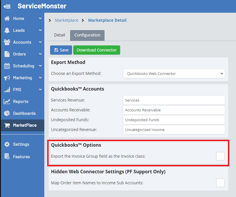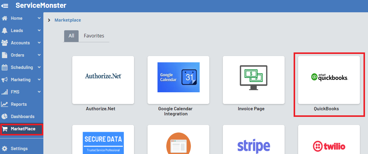In ServiceMonster, go to the Marketplace, and click on QuickBooks.