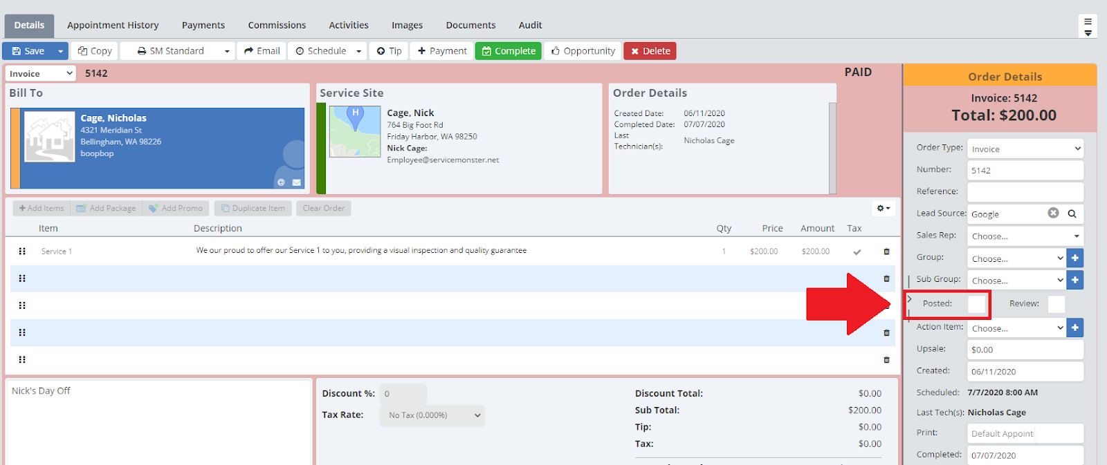 Once inside the order, go to the dashboard on the far right-hand side of the screen. Check the “Posted” box and click “Save”