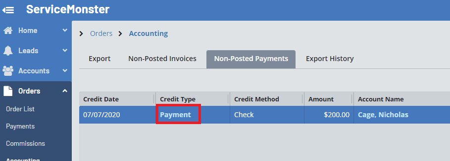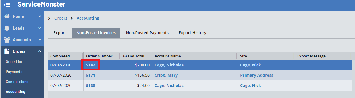 In ServiceMonster, select orders in the Navigator, then select accounting.