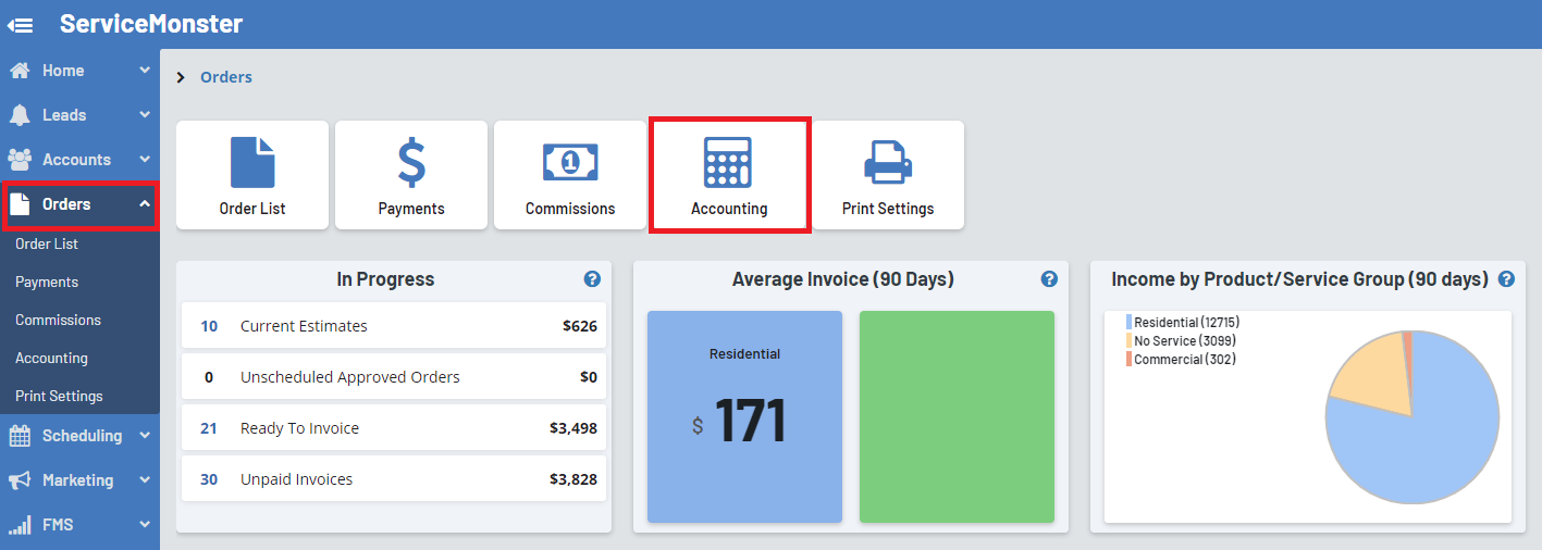 In ServiceMonster, select orders in the Navigator, then select accounting.