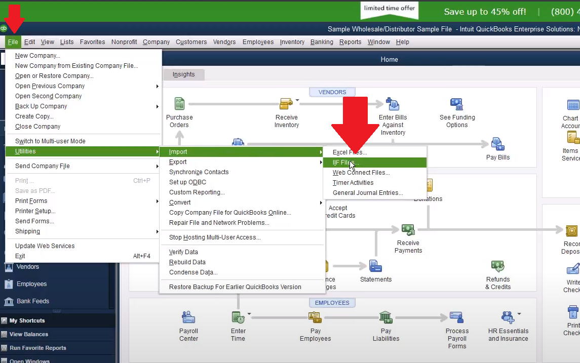 In Quickbooks go to “File”, “Utilities”, “Import”, then select “IIF Files”