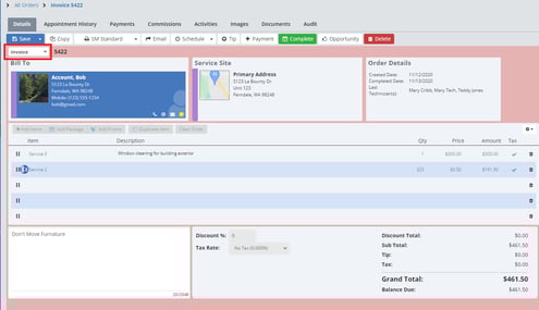 Click “Save”. (Turn your order back into an invoice as well by changing the drop-down menu back to “Invoice” and clicking “Save”)