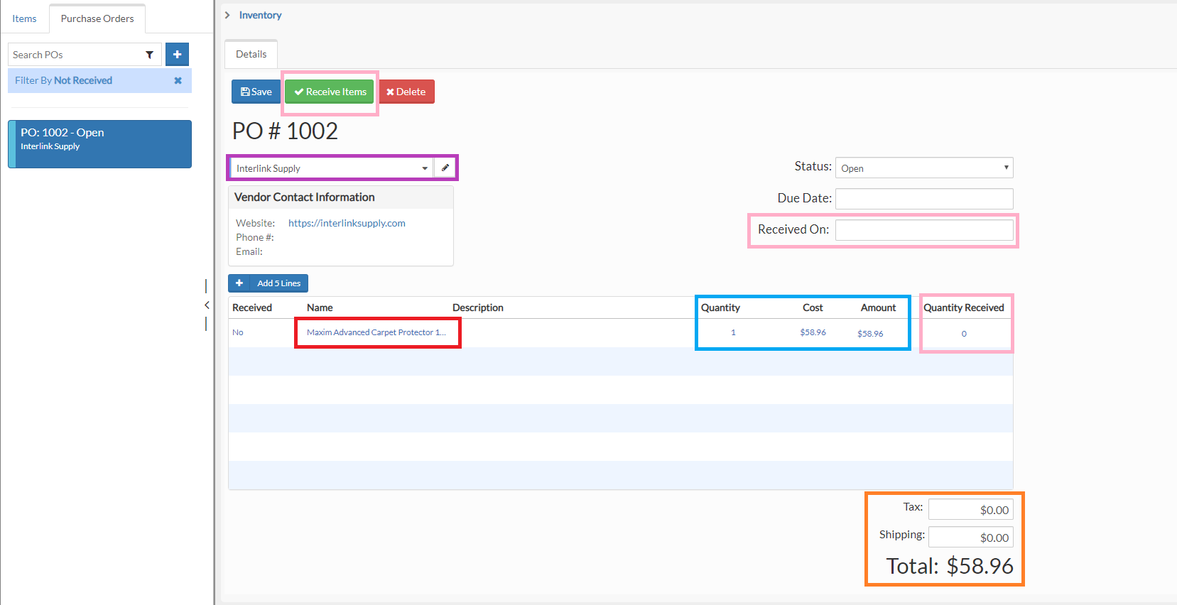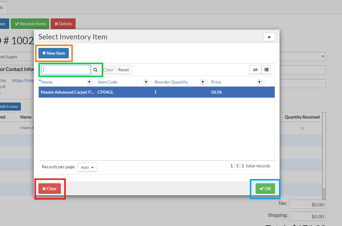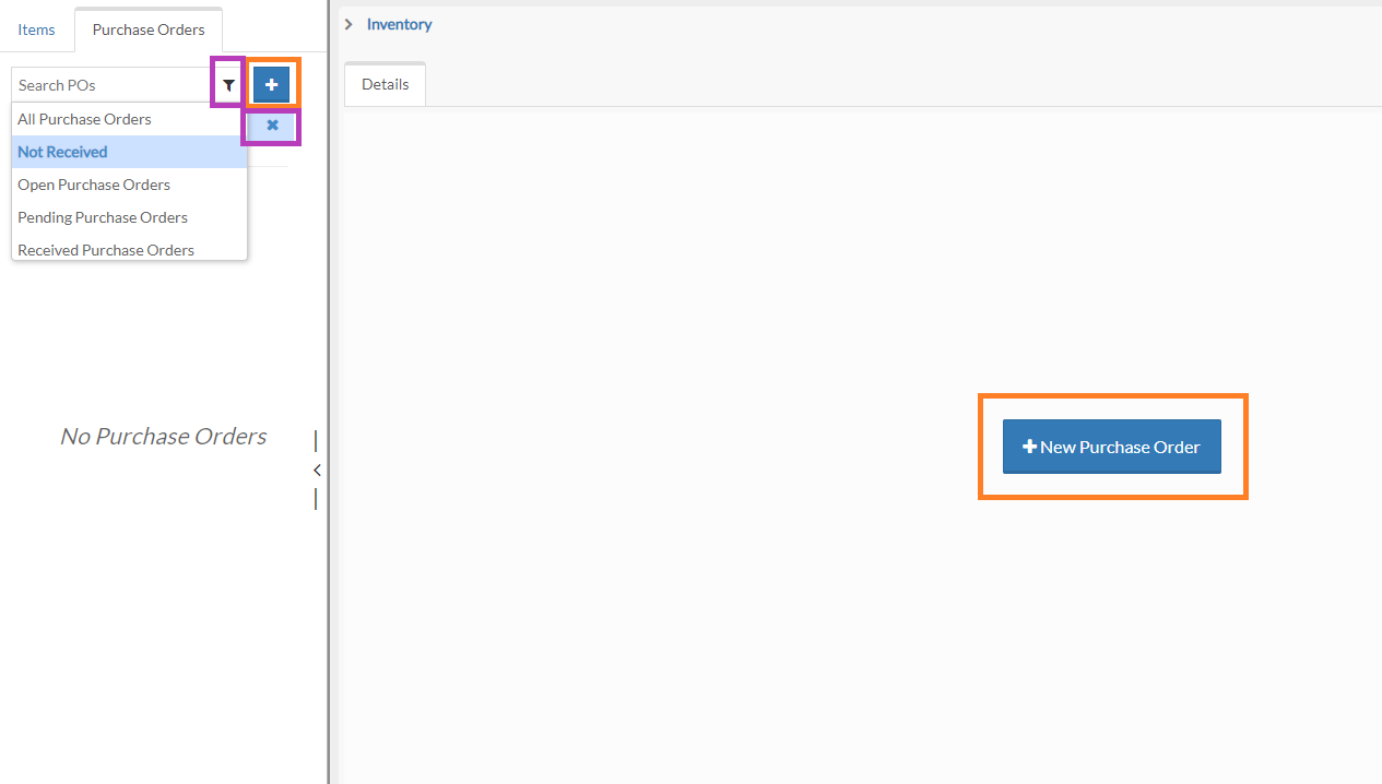 When you see a red indicator next to an inventory item, that means that you are below the necessary supply and need to re-order immediately. You can click Reorder from the item itself, or navigate to the PURCHASE ORDERS tab.