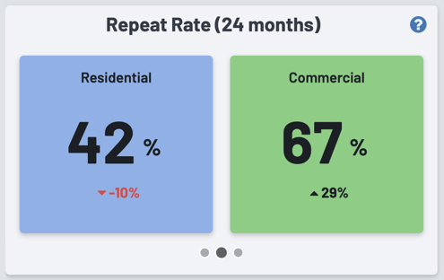 Repeat Rate is the number of customers you have serviced more than once in a two year period, broken-down by Residential and Commercial. In many industries this two year window helps identify whether you "retained" the customer or not.