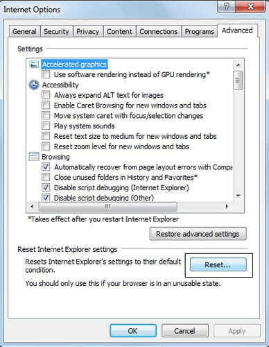 Click on Tools > Internet Options. Go to the Advanced tab. Click on the Reset button.