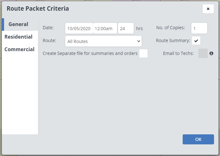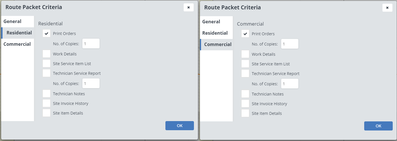 In the “Residential” and “Commercial” tabs you can select which information or pages will be included in the route packet.