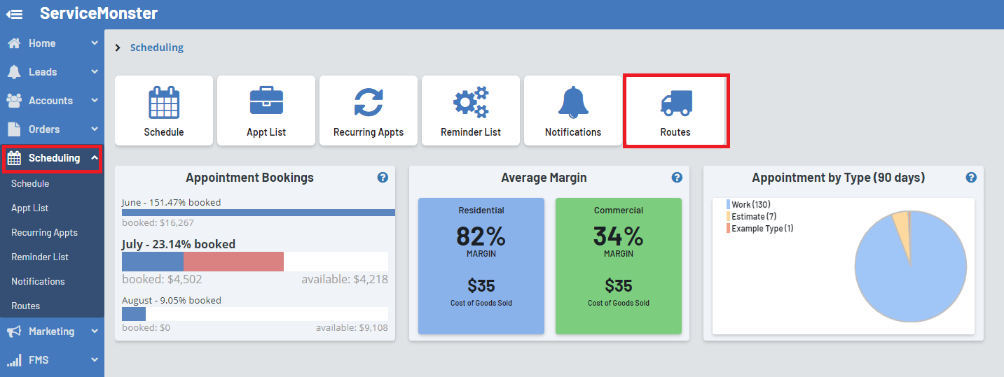 You can access the Routes page by clicking on the "Scheduling" tab from the Main Menu, and then on the "Routes" icon.