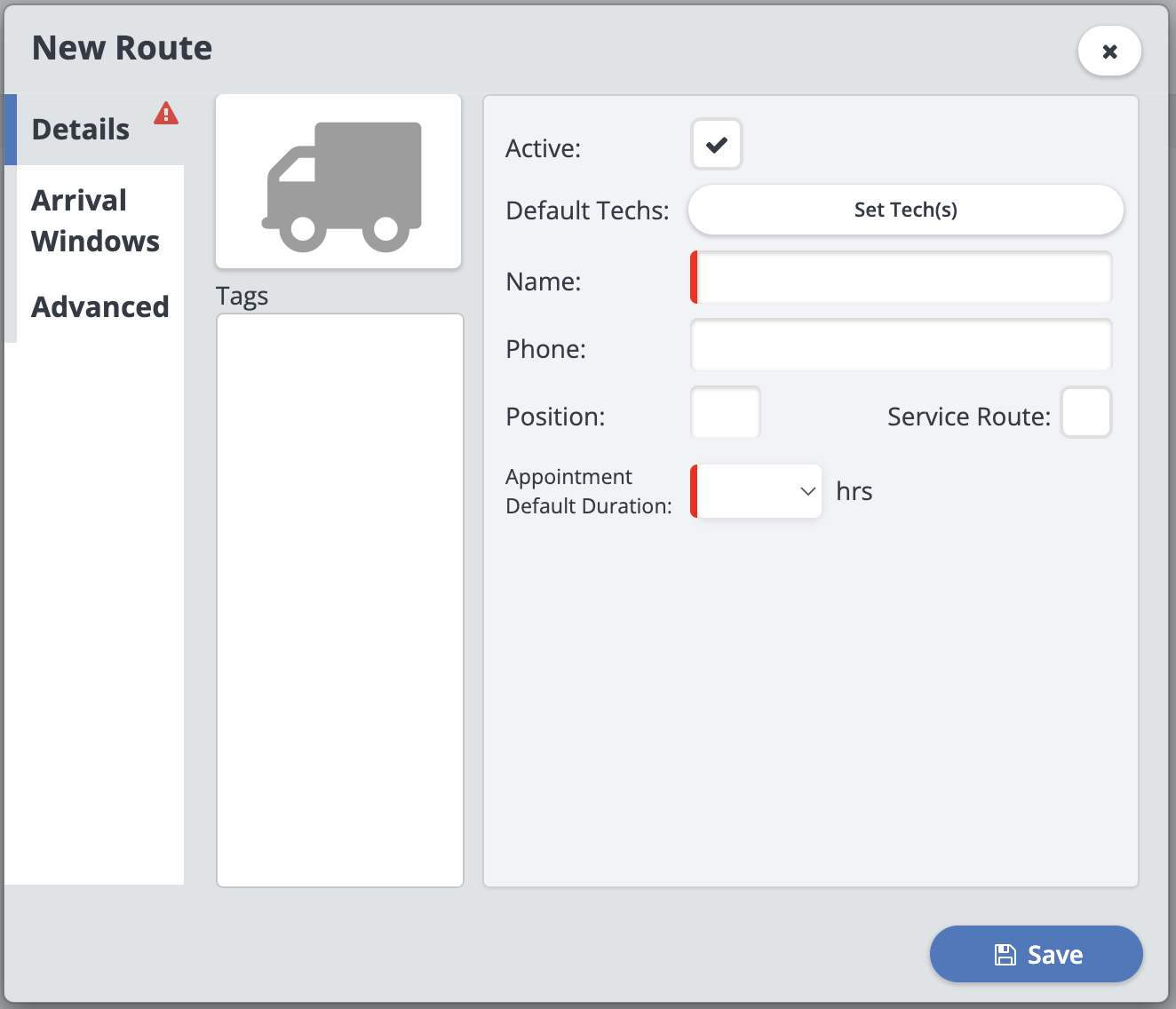 Click on the "+ Route" button to open up the "New Route" window, where you will see three tabs. Fields marked in red are required to save.