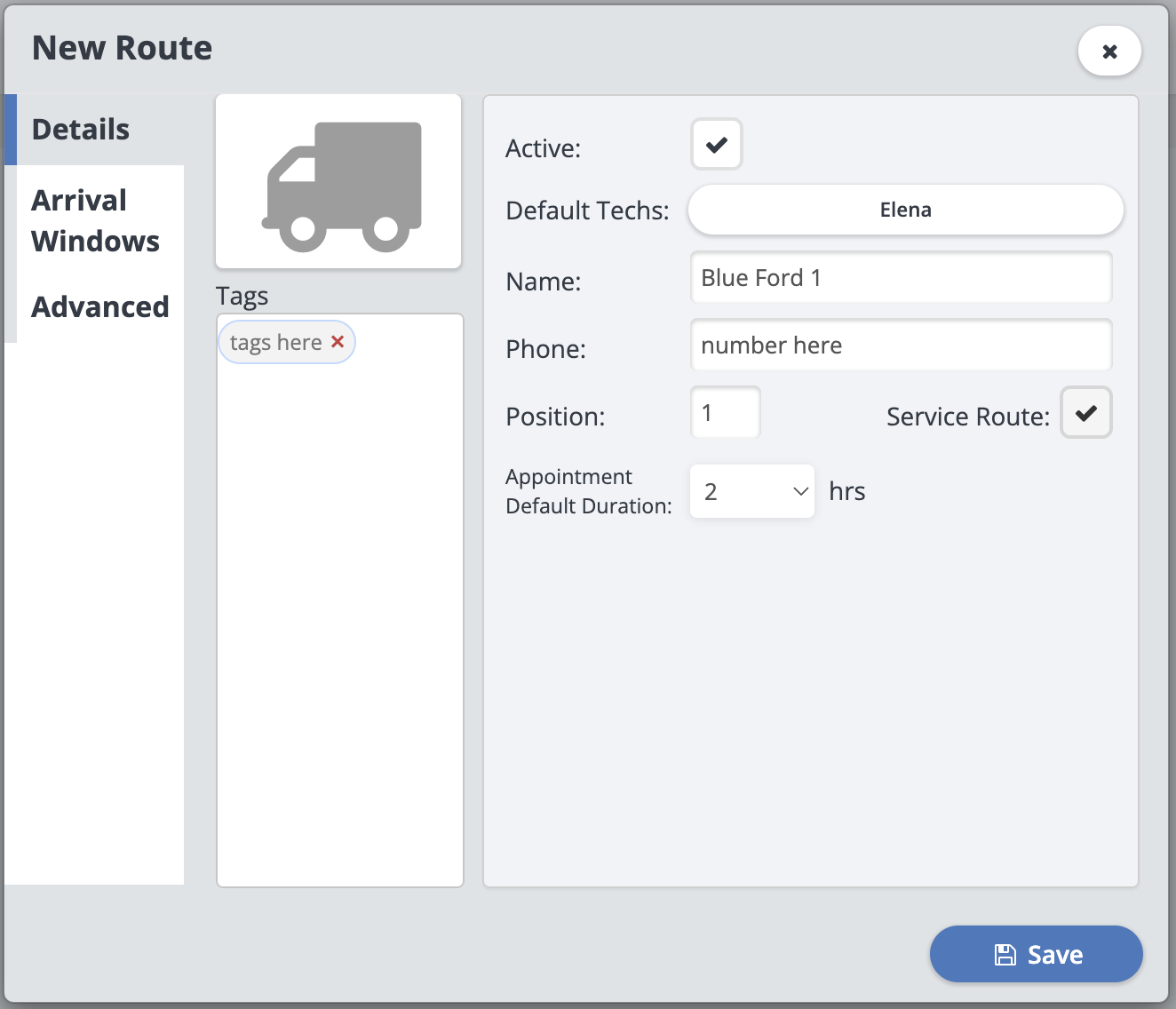 Tags: Think of these as tags on social media, you can add in grouping names or add tags you want to use to identify different groups. Type in the name of the Group (or Tag) that you want to create (i.e., Estimates). You can create multiple groups and assign a route to as many groups as you need. Also, no spacing is allowed in the group names (i.e., Rug Pickup would need to be entered as Rug Pickup).