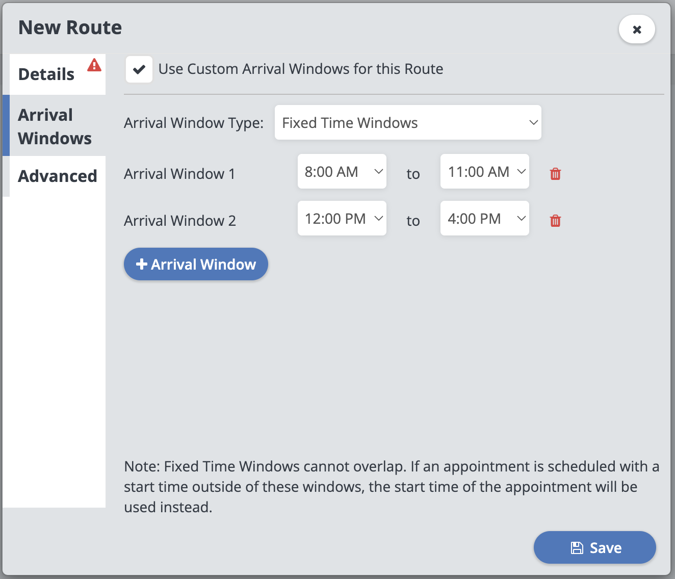 In the "Arrival Windows" tab you can customize the Arrival Windows for this route specifically.
