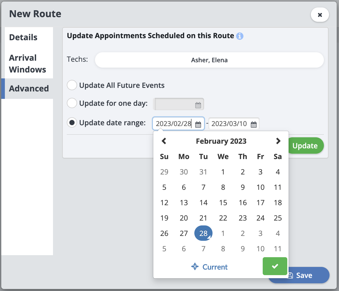 In the "Advanced" tab you can update the appointments already scheduled for this route by changing the assigned tech(s), and then select if you want to update this route for all future events, for a single day, or between a date range. This is a one-time update only, any newly schedule appointments will use the "default technicians" assigned on the Details tab as usual.