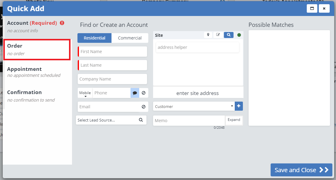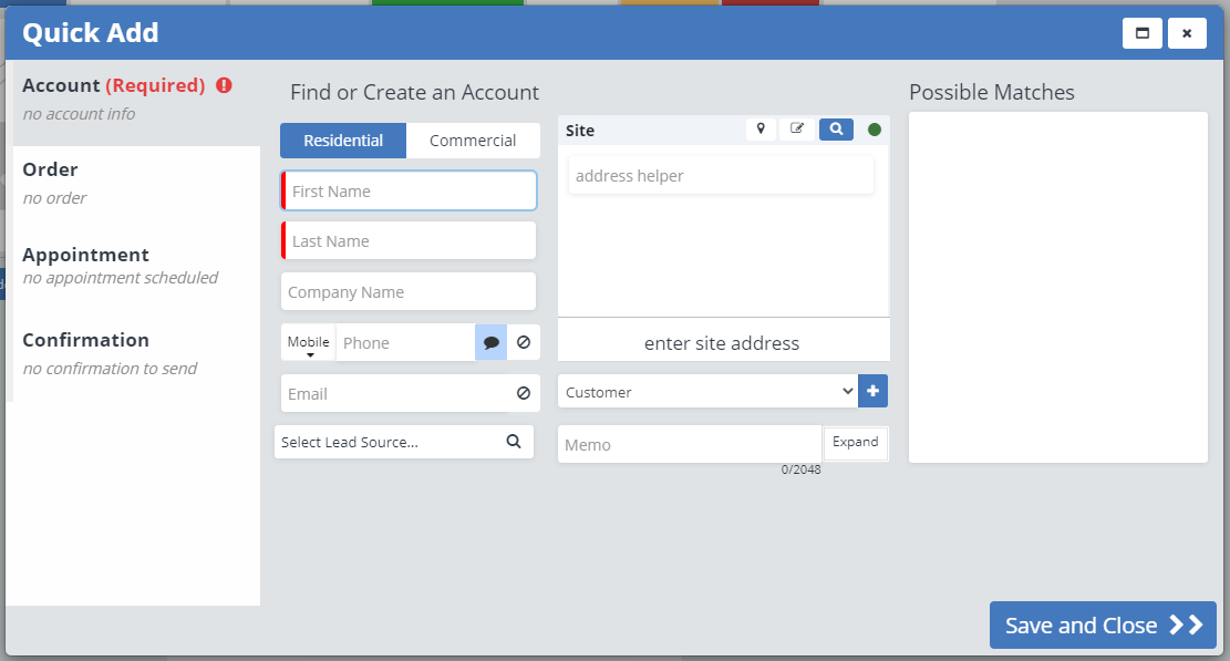 Enter in the account information, either creating a new account, or selecting an account from the Possible Matches box