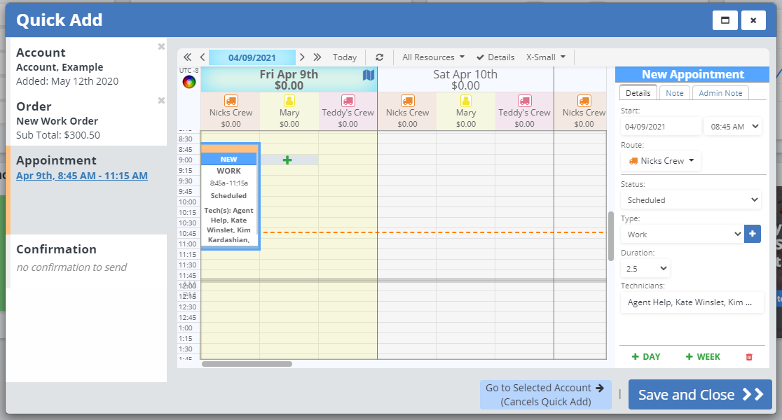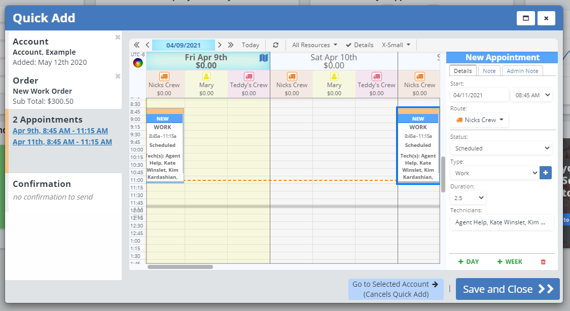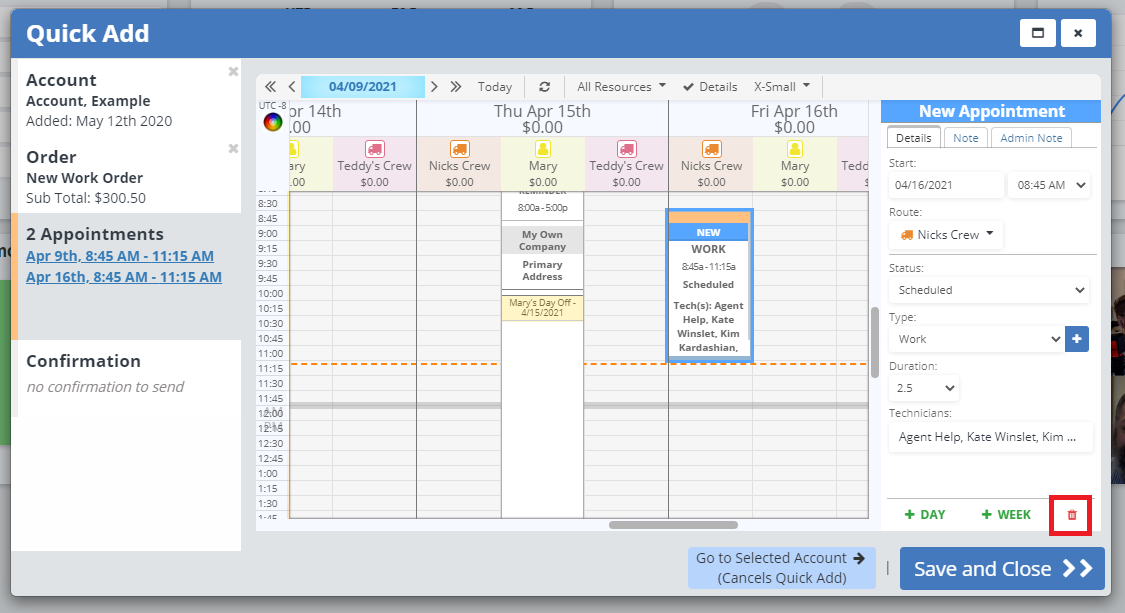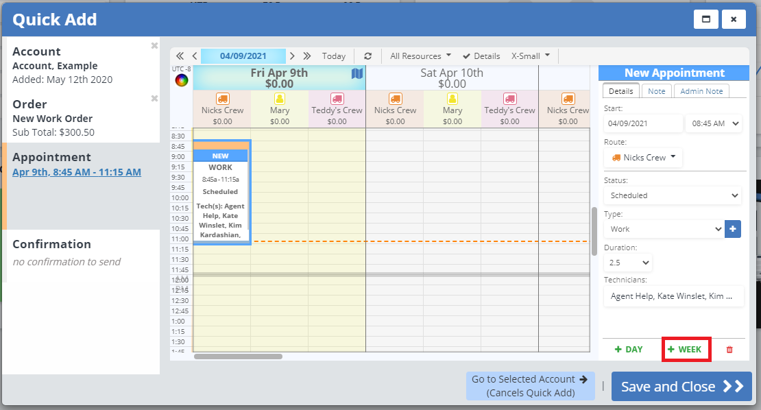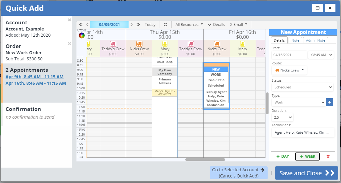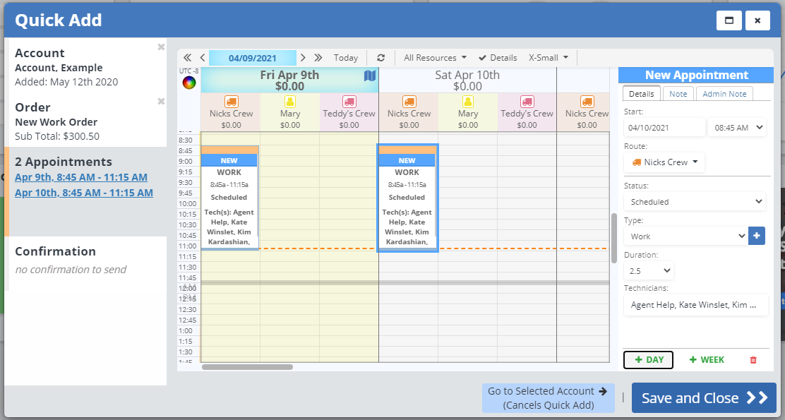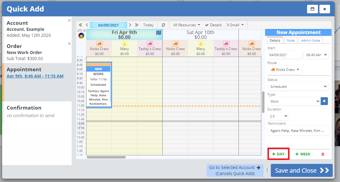 This will add an appointment the next day at the same time and on the same route as the last. You can edit the appointment as needed, or use the "+ Day" button as many times as needed.