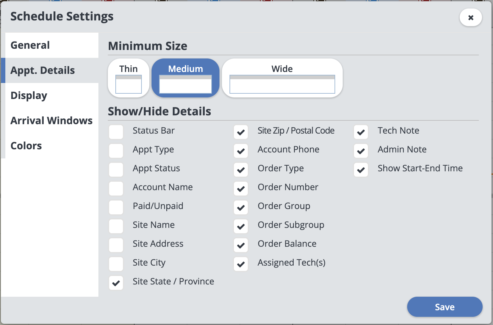 Show/Hide Details: Choose what details you want to appear on your appointments on the schedule.