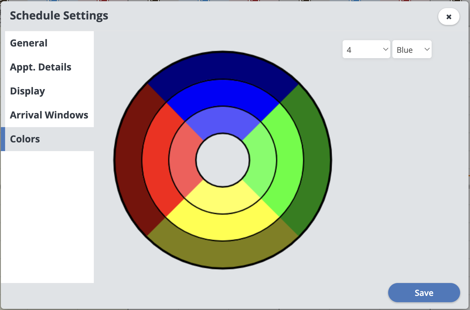 Schedule Settings (General, Appt. Details, Display, Colors)