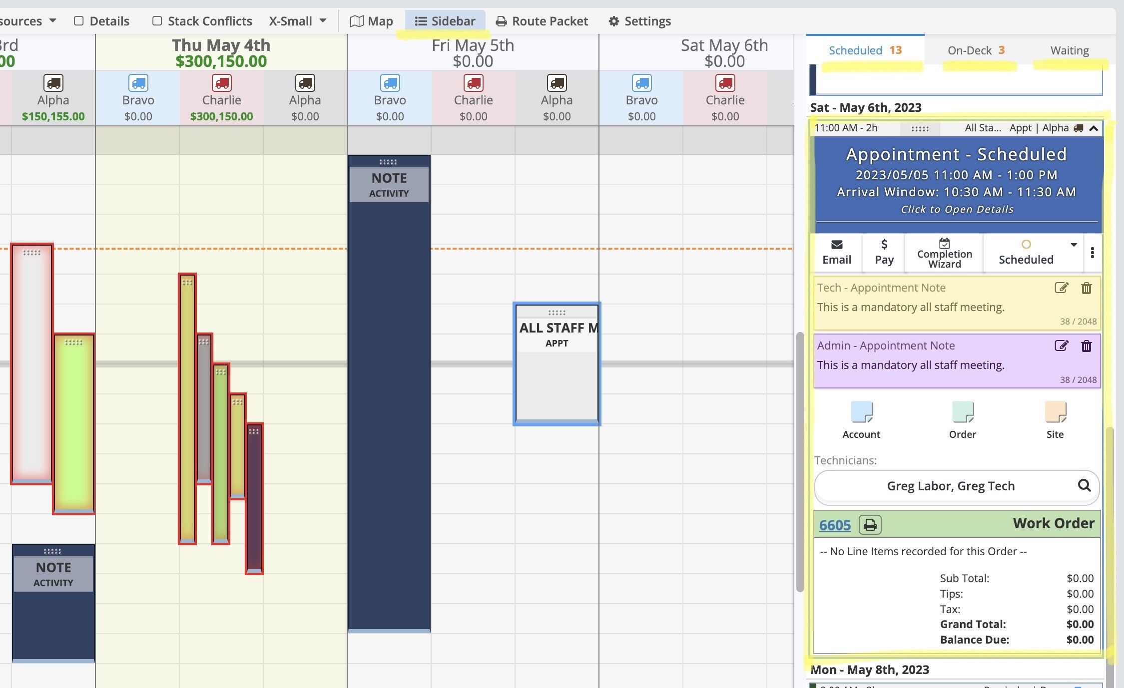 Clicking on the "Sidebar" button opens and closes the Sidebar on the right, where you can view your Appointments, the On-Deck, and the Waiting list.