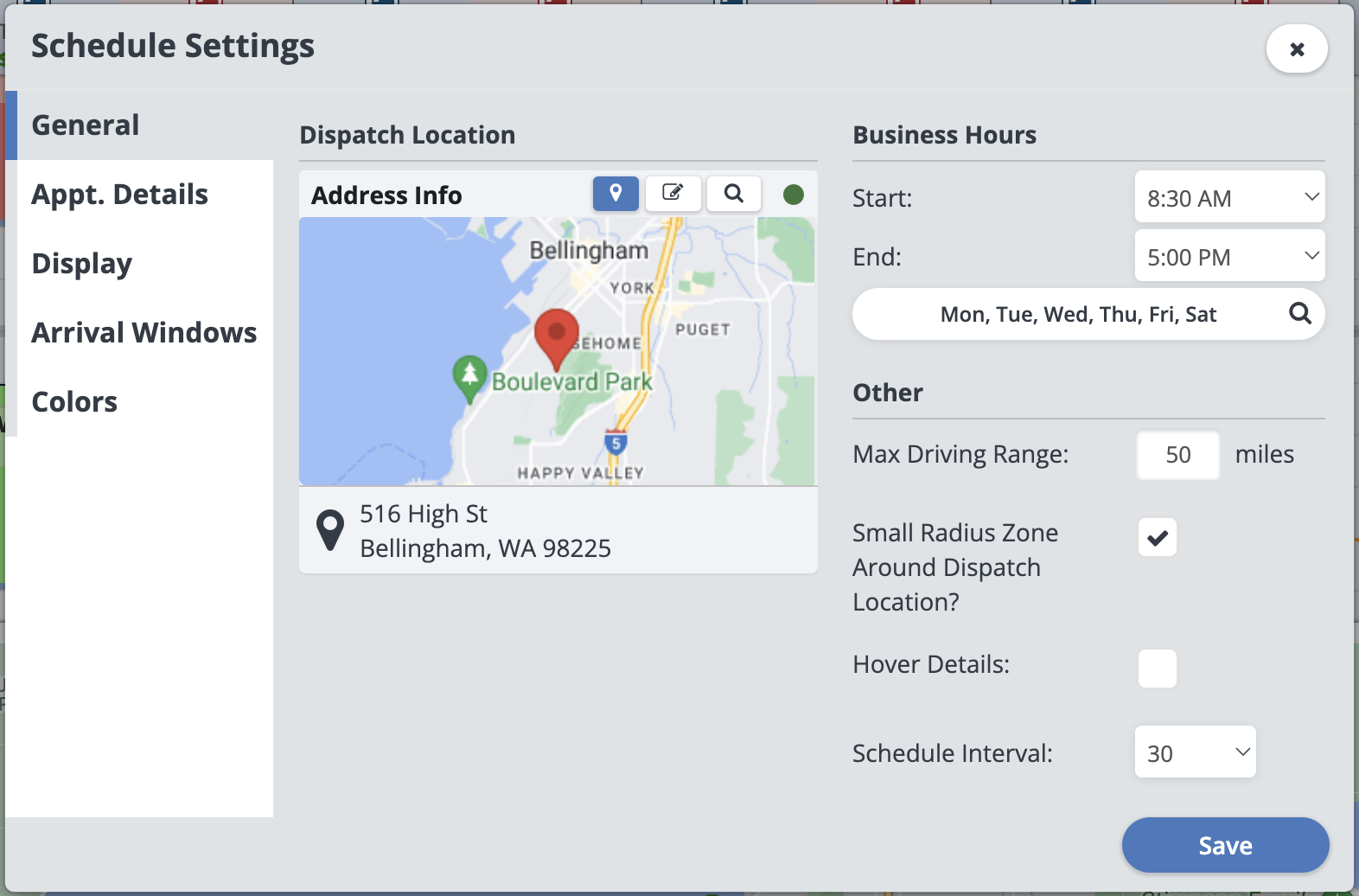 Dispatch Location: Using the Address Helper you can look up your dispatch location, this is the address you and your techs head out from everyday to do your jobs. Your clients will not be able to see this address. You will need a dispatch location entered into the system in order for our appointment color-coding to work (More on that in just a bit!). You can have one dispatch location per ServiceMonster account.